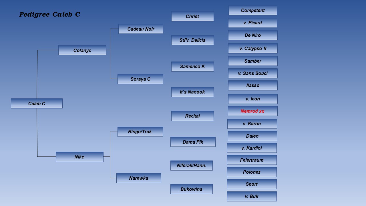 Caleb verbindet in einzigartiger Weise hocherfolgreiche Sportgene aus deutscher Leistungszucht (v.a. die Hengstlinien Christ/Competent, De Niro/Donnerhall, und Calypso II/Cor de la Bryere) mit der sehr leistungsbereiten, gesunden, vielseitig veranlagten bunten Trakehner-Linie der Cornelia (hieraus stammte u.a. auch der sportlich erfolgreiche Trakehner-Scheckhengst Camaro). Interessant ist der hochkarätige Vollblut-Anschluß im fallenden Pedigree dieses Hengstes über Nemrod xx, Nearco xx und Aquino xx, die für Härte, trockene Textur und Gesundheit stehen.