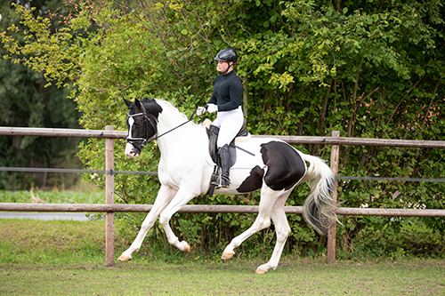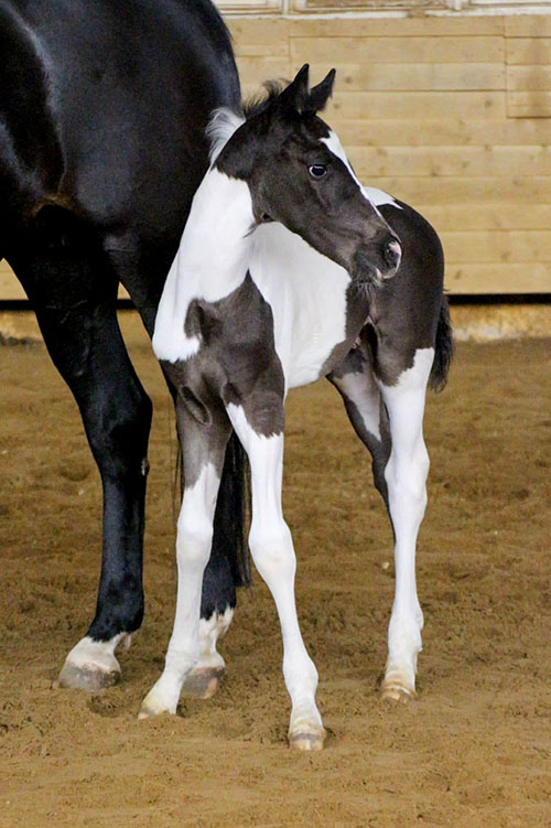Caleb ist REINERBIG für die Tobiano-Scheckung und REINERBIG DUNKEL (keine Fuchs-Schecken), ist damit einer von ganz wenigen FARBGARANTEN mit Zulassung in der Deutschen Warmblutzucht! Charakterlich läßt dieser Hengst keine Wünsche offen, ist sehr nervenstark, umgänglich und leistungsbereit, dazu unglaublich rittig. Hervorzuheben ist insbesondere sein sehr guter Schritt und seine Doppelveranlagung. Sein 1. Fohlenjahrgang 2023 konnte mehr als überzeugen. Moderne, schicke, langbeinige Typen mit tollem Ínterieur und sehr guten Bewegungen - bislang alle prämiert! Ein "Fohlenmacher" erster Güte! Einige Fotos seiner Nachkommen finden Sie ganz unten auf dieser Seite.