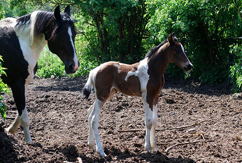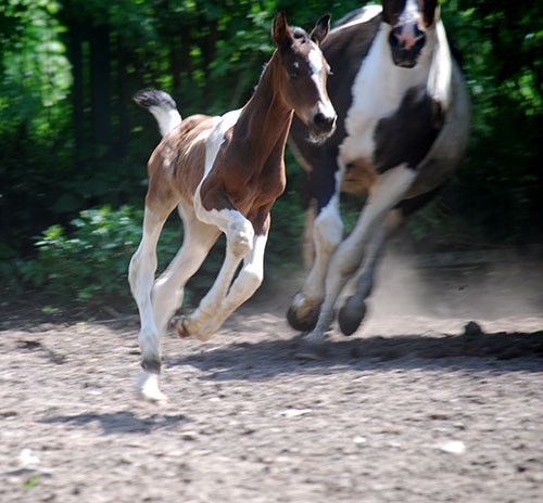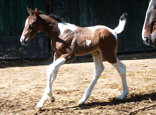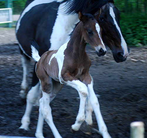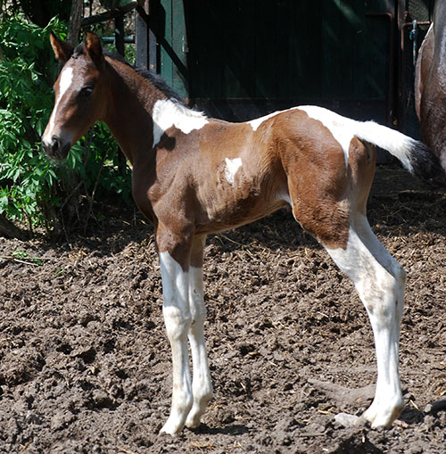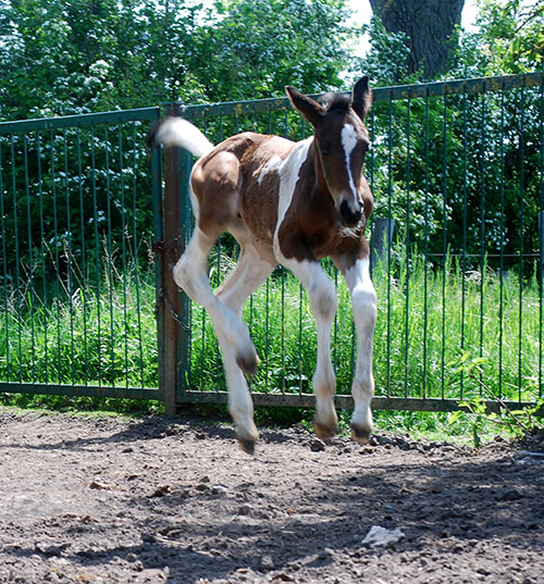 Ihr älterer, reinerbig bunter Vollbruder Caleb C wurde inzwischen vom ZfdP gekört, hat seinen 50-Tage-Test (Dressur) erfolgreich absolviert und damit die lebenslange Deckzulassung im Hengstbuch I erhalten. Er deckt hier bei uns auf Station.