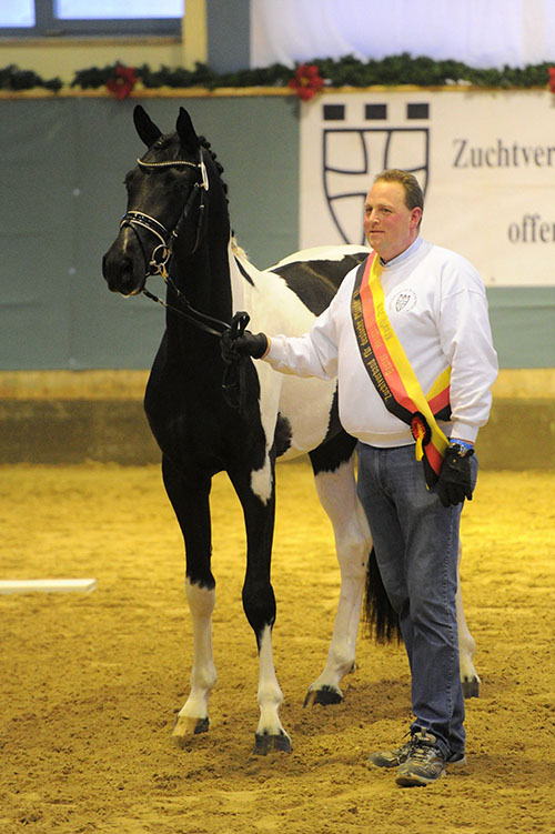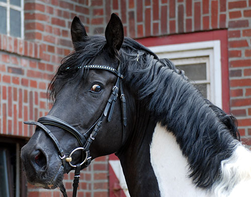 Über Worldchamp fließt das begehrte Blut der berühmten Hannoveraner Starvererber World Cup I und Argentan ins Pedigree; züchterisch gezielt kombiniert mit dem durch bewährtes Trakehner Edelblut geprägten rheinischen Siegerhengst Pasternak. Sportlich besonders wertvoll ist dann auch der Einfluss der Leistungsvererber Frühlingsball und Perseus in den folgenden Ahnenreihen dieses erfolgreichen Stutenstammes.Drei Staatsprämienstuten in direkter mütterlicher Linie beweisen nachdrücklich auch die hochkarätige züchterische Exterieurqualität des durchgezüchteten Mutterstammes. Mehrere Dressur- (Rashaan Badu, Fiona) und Springpferde (Dennoch, Lido) mit Erfolgen bis zur schweren Klasse belegen den hohen sportlichen Wert dieser Linie. Blickpunkt mußte leider 6-jährig nach einem Unfall kastriert werden. Briana C ist insofern vermutlich die weltweit einzige bunte Tochter dieses leider viel zu kurz züchterisch wirkenden Ausnahme-Vererbers, eine echte Rarität also. Blickpunkt soll nun jedoch seinen Weg in den großen Sport gehen - dafür wünschen wir diesem top Pferd alles Gute..."