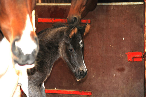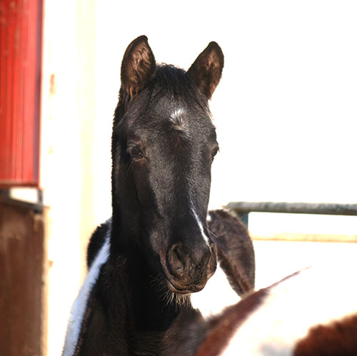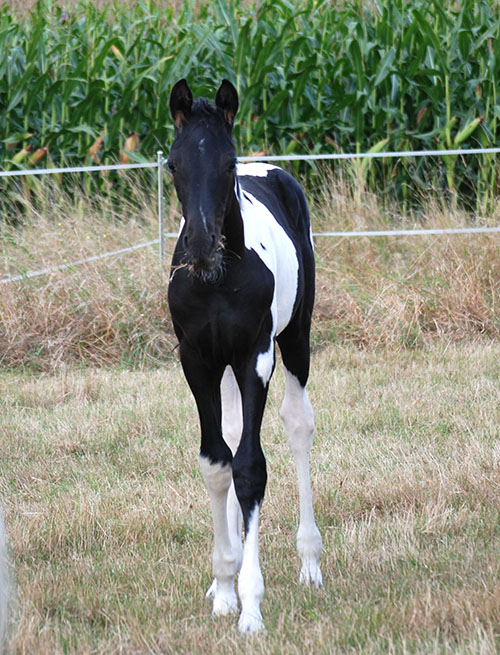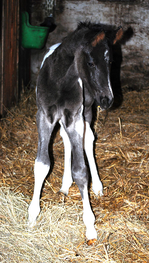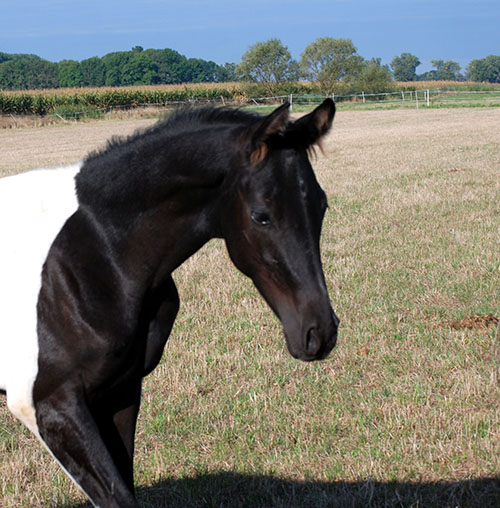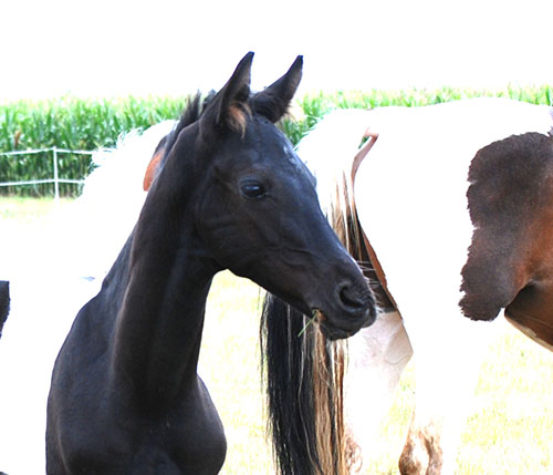 Dieses Hengstfohlen wurde am 14.05.2016 in Etgersleben geboren. Vater ist der lackschwarze Hannoveraner-Dressurhengst Cadeau Noir (Gestüt Bonhomme/Werder/Havel). Dieser bildschöne Vererber hat mich bereits 2-jährig sehr beeindruckt und ist für mich aktuell einer der besten Hengste Deutschlands.