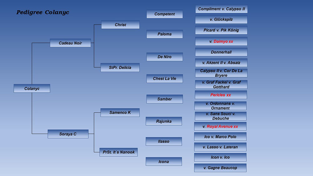 Colanyc besticht durch Leistungsbereitschaft, großzügige Bewegungsmechanik und höchste Rittigkeit, seine Nachkommen wurden bislang fast ausnahmslos prämiert. Großvater Cadeau Noir/Hann. (Gestüt Bonhomme) ist inzwischen siegreich auf internationalem Dressur-Grand Prix-Niveau mit immer wieder bestechendem Ausdruck und kraftvoller Bewegungsstärke. Muttervater Samenco K war selbst vielseitig bis zur Klasse S erfolgreich und überzeugte immer wieder durch erstklassige Nachkommen vor allem im Springsport. Großvater Ilasso war seinerzeit bunter HLP-Sieger Dressur, Urgroßvater Ico wiederum ein erstklassiger Springpferdevererber.