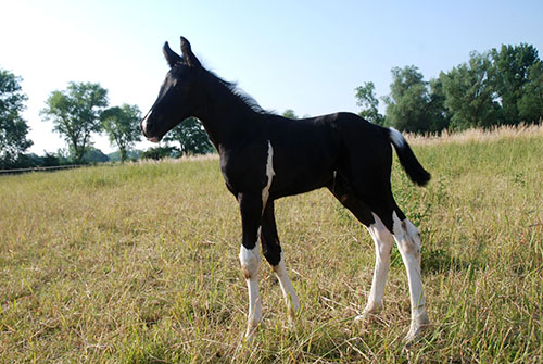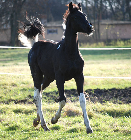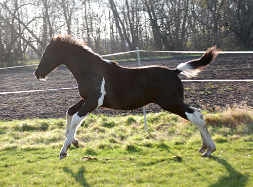 Vater dieses einmalig schön gezeichneten Minimalscheckhengstfohlens ist der hocherfolgreiche, lackschwarze Trakehnerhengst SCHWARZGOLD von Imperio/Consul, ein Veredlerhengst allererster Güte. Er wird per 22.07.2015 von der Hengststation wie folgt beschrieben (Zitat):