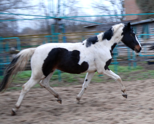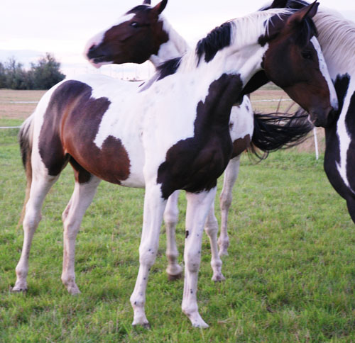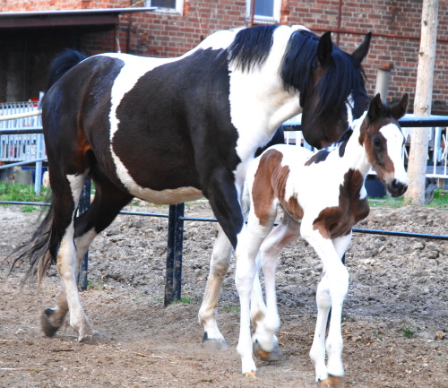 Silvana C zeigt schon im Alter von erst einigen Tagen bemerkenswerte Bewegungen, dabei durch den ganzen Körper schwingend und einen schönen, gesetzten Galopp. Die Qualität dieses Stutfohlens übertrifft deutlich unsere ohnehin schon hohen Erwartungen aus dieser Anpaarung. Wir dürfen also zu Recht gespannt sein auf die weitere Entwicklung dieses schicken Fohlens mit der dreifarbigen Schecken-Zeichnung.