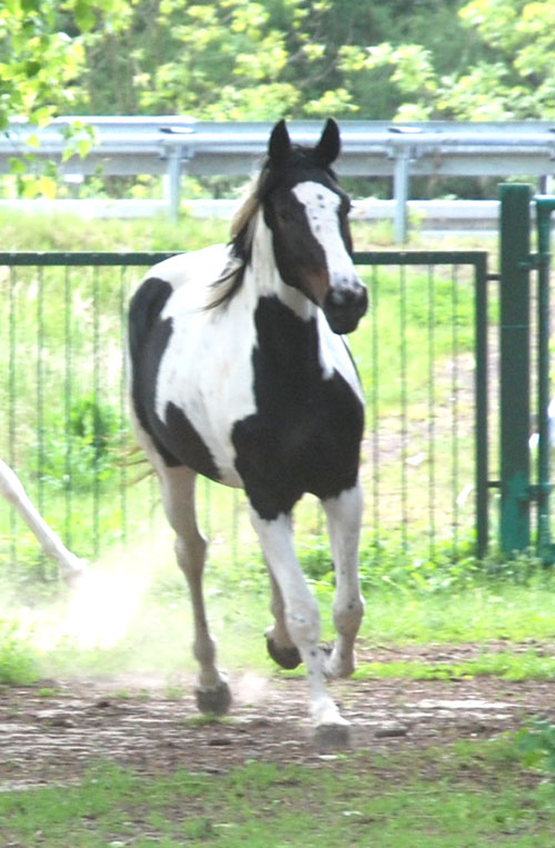 Laut DNA-Test ist dieses bewegungsstarke Stutfohlen HOMOZYGOT/REINERBIG für die Tobiano-Scheckung und bringt damit später auch bei Anpaarung mit einfarbigen Hengsten GARANTIERT bunte Nachkommen zur Welt!